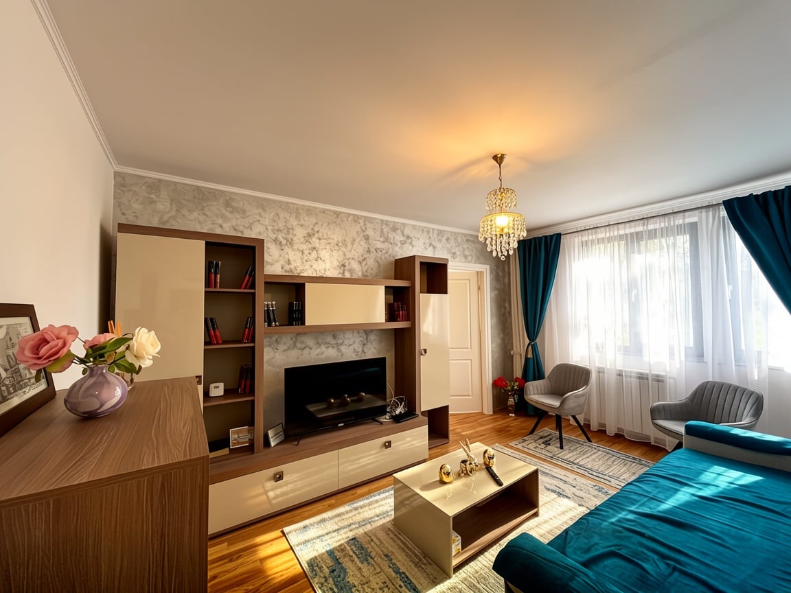 Primul contact cu apartamentul se face printr-o ușă de intrare metalică, care deschide calea către un hol practic și luminat. Spațiul living-dormitor se întinde generos, cu pereții finisați în vopsea lavabilă în tonuri neutre și pâlpâit plăcut sub lumina ce penetrează prin geamurile din PVC cu termopan. Pardoseala combină parchet în zonele principale cu gresie în arii funcționale, creând o progresie logică între spații. Mobila modernă decorează încăperea cu gust discret, iar ușile interioare din lemn completează aspectul curat și contemporan.