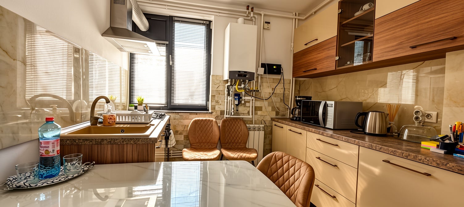 Bucătăria, deși compactă, este complet echipată cu electrocasnice noi și mobilier funcțional. Organizarea spațiului permite utilizarea eficientă a fiecărui centimetru, iar finisajele în faiață și pereți lavabili asigură ușurința de întreținere. Gresiul pe pardoseală facilitează curățenia în această zonă de activitate.