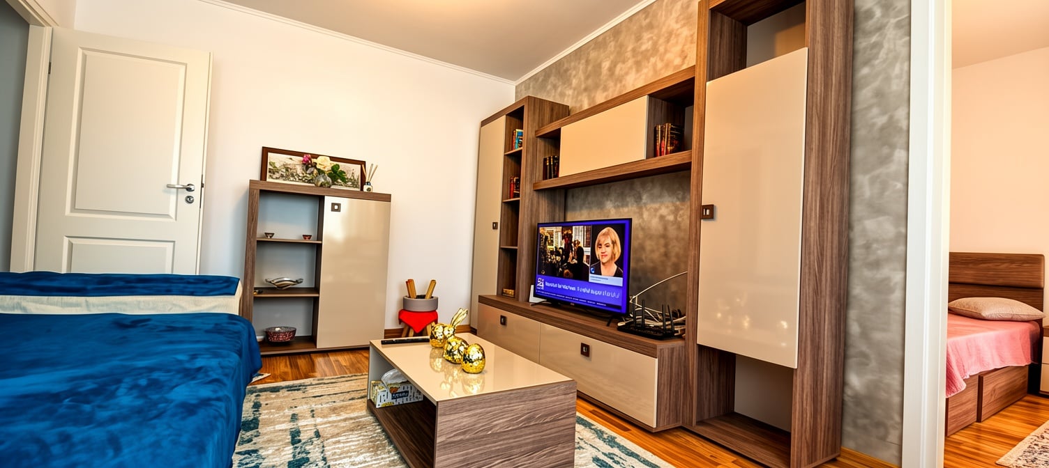 Primul contact cu apartamentul se face printr-o ușă de intrare metalică, care deschide calea către un hol practic și luminat. Spațiul living-dormitor se întinde generos, cu pereții finisați în vopsea lavabilă în tonuri neutre și pâlpâit plăcut sub lumina ce penetrează prin geamurile din PVC cu termopan. Pardoseala combină parchet în zonele principale cu gresie în arii funcționale, creând o progresie logică între spații. Mobila modernă decorează încăperea cu gust discret, iar ușile interioare din lemn completează aspectul curat și contemporan.