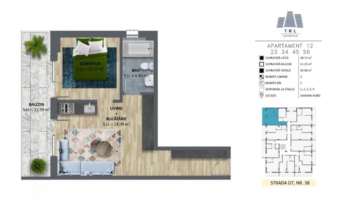 TRL RESIDENCE va prezinta proiectul ansamblului rezidential, ce cuprinde 69 de apartamente cu 2 camere si garsoniere, situat in Mamaia Nord, Strada D7, nr. 38 la 400 m de faleza pietonala Mamaia - Navodari si la 300 m de noul LIDL, cu termen de predare in luna decembrie, anul 2023.